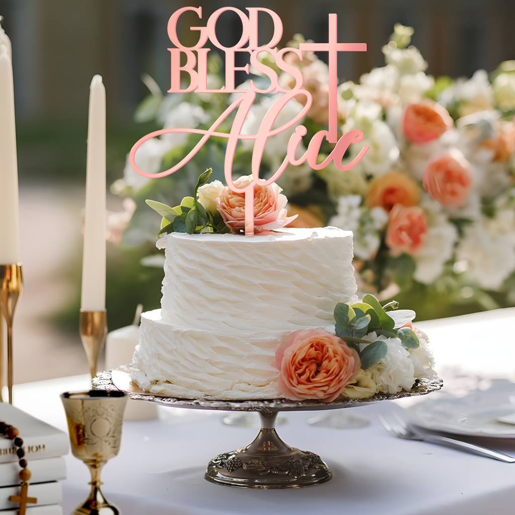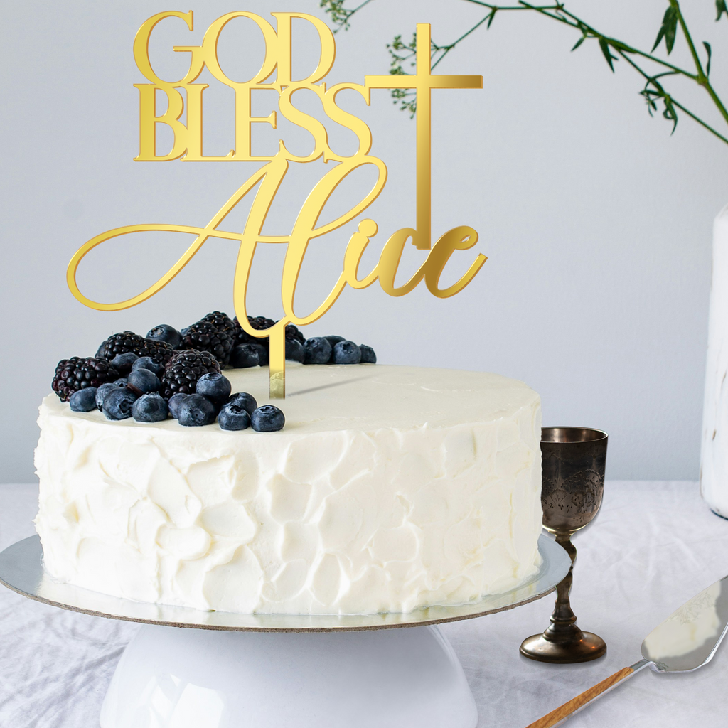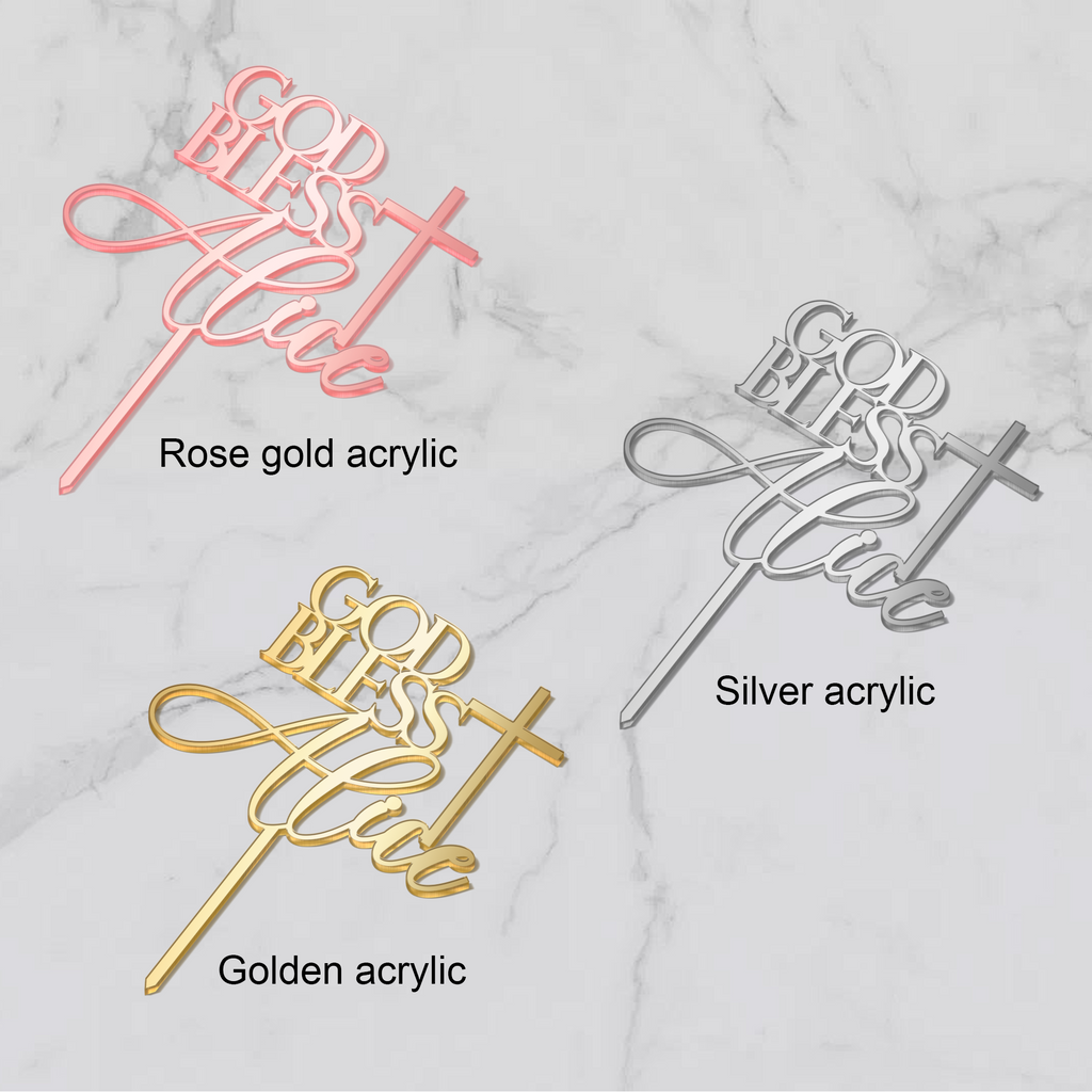 Personalized God Bless Baptism Cake Topper in Acrylic with Cross D2 - Custom Name
